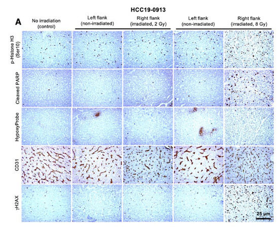 Immunostaining of HCC19-0913 tumors from control and RT-treated mice (Figure 2A) revealed that tumors irradiated with 8 Gy showed a 2–2.8-fold higher proportion of p-Histone H3 Ser10-positive cells (Figure 2B) compared with left flank tumors, indicating that RT arrests cells at mitosis [26]. Furthermore, there was a 29–30-fold increase in cleaved PARP-positive cells (Figure 2C) and a 140–150-fold increase in p-Histone H2AX Ser139 (γH2AX)-positive cells (Figure 2D). These results suggest that RT caused DNA damage and induced apoptosis in HCC cells. However, there was no significant difference in the number of cells staining positively for p-Histone H3 Ser10 (Figure 2B), cleaved PARP (Figure 2C), or γH2AX (Figure 2D) between the left flank control and the 2 Gy-irradiated tumors. Morphologically, cells and nuclei in HCC19-0913 tumors irradiated with 8 Gy were slightly larger compared with the controls.