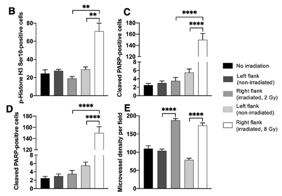 Effects of localized radiotherapy on angiogenesis, cell proliferation, apoptosis, and blood vessels in HCC19-0913 tumors. HCC19-0913 tumors were implanted on both flanks, and tumors on the right flank were irradiated with either 2 or 8 Gy. Tumor tissues were collected 2 days post-irradiation and subjected to immunohistochemistry. Representative images of tumor sections from control non-irradiated mice, internal control (left flanks), and irradiated tumors (right flanks) were stained for blood vessels (CD31), p-Histone H3 Ser 10, cleaved PARP, γH2AX, and Hypoxyprobe as described in Appendix A (A). The number of staining-positive cells among at least 500 cells per region was counted and is expressed as the number of positive cells per 1000 cells ± SE (B–D). For the quantification of mean microvessel density, five random fields at a magnification of ×100 were selected for each section. The number of CD31-positive blood vessels per field was counted as described in Appendix A and presented as mean ± SE (E). ** p < 0.01; **** p < 0.0001, Student’s t-test.