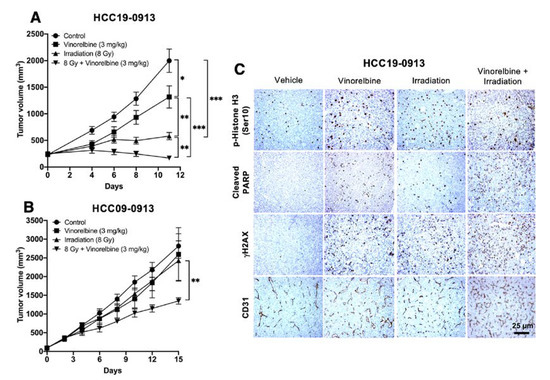 For the dose-response experiment, 5 mice per group bearing the HCC19-0913 xenografts were irradiated with 0, 2, 6, and 8 Gy. For the RT/Vinorelbine combination studies, mice were treated as follows: (1) IP injection with 200 µL vehicle (control), (2) a single irradiation dose of 8 Gy, (3) IP injection with 3 mg/kg Vinorelbine, and (4) combined 8 Gy and IP injected Vinorelbine. The vehicle and Vinorelbine were injected every 3.5 days. Tumor measurements were collected as described (Appendix A).