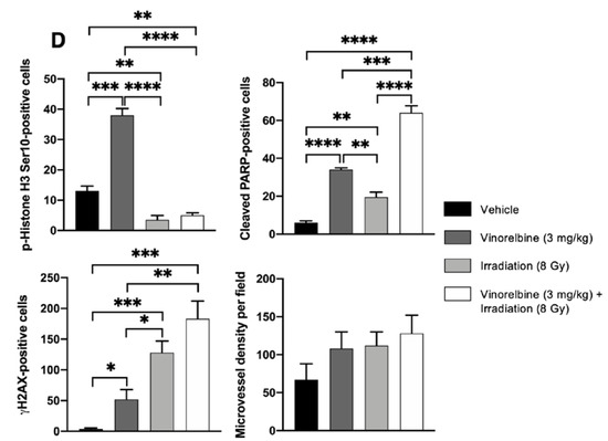 Relative to the control, Vinorelbine-treated HCC19-0913 tumors had a 2.1–3.2-fold higher proportion of p-Histone H3 Ser10-positive cells (p = 0.00023), suggesting the ability of Vinorelbine to arrest cells in mitosis [26]. Interestingly, RT significantly reduced p-Histone H3 Ser10-positive cells (p = 0.0095) and attenuated Vinorelbine-induced upregulation of p-Histone H3 Ser10 (Figure 3C,D). Vinorelbine was more potent than RT in inducing apoptosis, as determined by the percentage of cleaved PARP-positive cells (p = 0.0046). In contrast, RT was more potent in inducing DNA damage than Vinorelbine, as indicated by γH2AX staining (Figure 3C,D). The combination of RT/Vinorelbine also caused more DNA damage than RT alone, as indicated by a more intense γH2AX staining (Figure 3C). The RT/Vinorelbine combination showed 1.8–2-fold (p = 0.0005) and 3-fold (p = 0.00015) more cleaved PARP-positive cells than Vinorelbine and RT treatment alone, respectively (Figure 3D). Similar data were obtained when HCC30-0805B and HCC09-0913 tumors were analyzed (Figures S3 and S4). Compared to non-irradiated or Vinorelbine-treated tumors, RT slightly increased the blood vessel density in HCC30-0805B but not in HCC09-0913 tumors (Figure 3C; p = 0.024).