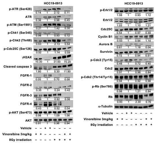 The following are available online at https://www.mdpi.com/2072-6694/12/4/872/s1, Figure S1: The effects of radiotherapy on cell cycle in vitro and the effects of localized radiotherapy on the DNA repair pathway, receptor tyrosine kinases (RTKs), and its downstream targets in the HCC19-0913 model, Figure S2: Effects of localized RT, Vinorelbine, and localized RT plus Vinorelbine on the HCC13-0212 PDX model, Figure S3: Effects of localized RT, Vinorelbine, and localized RT plus Vinorelbine on the HCC30-0805B PDX model, Figure S4: Effects of localized RT, Vinorelbine, and localized RT plus Vinorelbine on the HCC09-0913 PDX model, Figure S5: RT (8 Gy) plus Vinorelbine was synergistic.