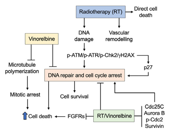 Proposed mechanism for Vinorelbine’s radio sensitizing effect. Radiotherapy induces DNA damage that activates the p-ATM/p-ATR/p-Chk2/γH2AX pathway, which in turn activates the cell cycle control protein, leading to G2/M cell cycle arrest and DNA repair. Under normal circumstances where DNA is repaired, cells continue to proliferate. However, failure to repair damaged DNA leads to cell death. Radiotherapy also induces vascular remodeling by increasing vascular density, which may facilitate the delivery of Vinorelbine. Vinorelbine alone inhibited microtubule polymerization, leading to mitotic arrest and cell death. Furthermore, Vinorelbine inhibited the p-ATM/p-ATR/p-Chk2 pathway, thus reducing cellular DNA repair, which results in increased cell death. Increased levels of DNA damage, the inability to repair DNA, inhibition of FGFR expression, and prolonged mitotic arrest due to inhibition of Cdc25C, Aurora B, survivin, and p-Cdc2 by the combination of RT/Vinorelbine led to more cell death, indicated by elevated levels of cleaved caspase 3.