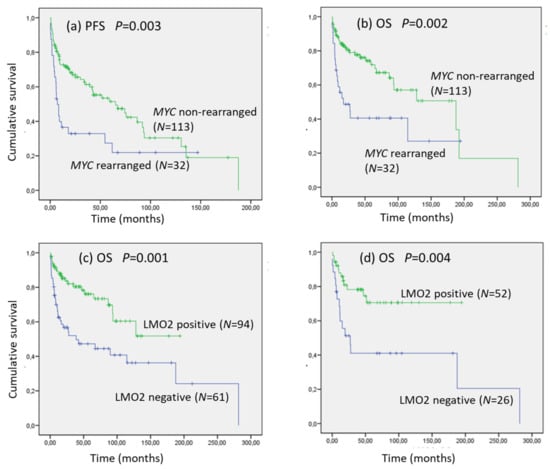 Progression-free survival (PFS) (a) and overall survival (OS) (b) of MYC rearrangements in 155 LBCL. OS of LMO2 expression in 155 LBCL (c) and 78 CD10-positive LBCL (d).
