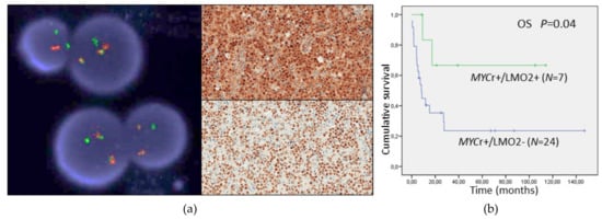 - Colomo, L.; Vazquez, I.; Papaleo, N.; Espinet, B.; Ferrer, A.; Franco, C.; Comerma, L.; Hernandez, S.; Calvo, X.; Salar, A.; et al. LMO2-negative Expression Predicts the Presence of MYC Translocations in Aggressive B-Cell Lymphomas. Am. J. Surg. Pathol. 2017, 41, 877–886. [Google Scholar] [CrossRef]