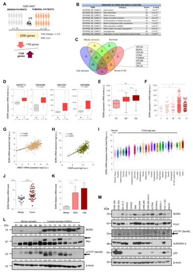 BORA is overexpressed in OC associated with poor prognosis. (A) Gene expression analysis comparing human epithelial ovarian surface tissues to ovarian carcinoma ovaries using data contained in the GSE 14407 dataset. (B) Functional annotation of upregulated genes reported by DAVID Bioinformatics 6.8. (C) Venn diagram illustrating the overlap of genes with the indicated filters. (D) Examination of BORA mRNA expression in published ovarian transcriptomic profiles comparing benign versus tumoral samples. (E,F) BORA mRNA expression levels in TCGA ovarian samples (n = 541 specimens) categorized by histological grade and clinical disease stage. (G) Correlation (Pearson) between BORA mRNA levels to MKi67 transcriptional expression and to (H) CIN25 expression in the ovarian TCGA cohort. (I) BORA mRNA expression levels in different tumor types from the TCGA repository. Data were retrieved from the TCGA database using the R2 Genomic Visualization platform. (J) BORA expression is higher in tumoral OC primary samples (n = 40) compared to benign ovaries (n = 20) and (K) correlates with late clinical stage. All values of mRNA were normalized to GAPDH. (L) Immunoblot showing protein levels of BORA, PLK1 and pTCTP-Ser46 in fresh-tissues from benign (n = 6) and HGSC primary ovaries (n = 8). (M) Immunoblot analysis of BORA, PLK1, pTCTP-Ser46, AURORA A and p53 in ovarian cell lines, including 12 tumoral lines and two nontumoral IOSE clones. β-Actin was used to control equal protein loading in L and M. P-values were calculated using a two-tailed Student’s t-test. * p < 0.05; ** p < 0.01; *** p < 0.001, **** p < 0.0001.