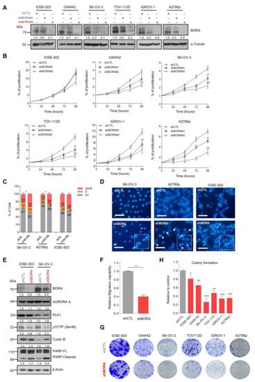 The function of PLK1 in sustaining the proliferative capacities of cancer cells has been previously reported [36]. Thus, having established BORA as a determinant factor for ovarian tumorigenesis, we predicted that BORA might also regulate the viability of OC cells. Knocking down BORA with two independent lentivirus-based shRNAs reduced protein levels efficiently in all tested ovarian cell lines (Figure 3A). A significant impairment of cell proliferation was observed in the five OC cell lines studied, especially with shBORA#2 (hereinafter shBORA); while the effect in the IOSE line was considerably less pronounced (Figure 3B). We then proceeded to deepen into the phenotypical consequences of BORA depletion. Fluorescence-activated cell sorter FACS analysis revealed that BORA silencing promoted a G2/M phase arrest in SK-OV-3 and A2780p cells with a concomitant decrease in the percentage of cells in G1 phase (p < 0.05; Figure 3C), concurring with previous reports [3,37], while IOSE shBORA -infected cells displayed a similar cell cycle prolife to shCTL cells (Figure 3C). Moreover, chromatin staining of shBORA-infected cells showed an apoptosis-consistent pattern of condensed and/or fragmented chromatin 96 h post-transduction, while shCTL -infected cells displayed uniform chromatin staining (white arrowheads; Figure 3D; data quantification in Figure S5a). BORA knockdown was accompanied by a reduction in the surrogate marker of PLK1 activity, pTCTP-Ser46, but not in the basal levels of PLK1 and AURORA-A kinases as previously reported [3], suggesting that, at least, part of the consequences of BORA depletion are due to reduced PLK1 activity (Figure 3E). Cyclin B1 immunoblot in SK-OV-3-transduced shBORA cells confirmed the pronounced G2/M arrest followed by higher PARP cleaved levels pointing towards a caspase-dependent apoptosis after BORA depletion in tumoral cells (Figure 3E). BORA depletion was also accompanied by lower migration capacities in transwell assays (Figure 3F). To extend our findings of BORA functions in other tumors, we silenced BORA in a subset of other cancer cell lines from prostate, endometrial, neuroblastoma and colon cancer. We observed that BORA depletion resulted in decreased cellular proliferation in all models tested (Figure S5b,c). Long-term colony formation assays also reflected a reduced number of colonies, when transduced with shBORA viruses, compared to shCTL cells (Figure 3G,H). Interestingly, all BORA-depleted surviving colonies in the A2780p cell line expressed lower, but residual levels of BORA compared to clones derived from A2780 shCTL (Figure S5d), thereby suggesting that minimal BORA expression is able to sustain cellular division, in agreement with the report of Bruinsma et al. [38]. To ascertain if OC cells were able to survive with complete BORA depletion, we designed a gRNA to target exon 2 of BORA and cloned it into a CRISPR/Cas9 vector (pSpCas9 (BB)-2A-GFP) [39]. We failed to obtain single cell clones with no BORA protein levels at all, and only clones with reduced but residual BORA levels were obtained, which mirrored our previous results with shRNA-mediated depletion of BORA (Figure S5e,f). These data support the notion that the complete depletion of BORA is most likely lethal for cells, but much reduced levels of BORA are enough to sustain cellular proliferation of OC cells.