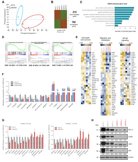Having established that BORA could represent a promising therapeutic agent, we wanted to discern the landscape of proteins and pathways modulated upon BORA silencing that caused this phenotype and thus identify potential BORA target genes hitherto unknown. To this end, a whole-genome expression analysis in SK-OV-3 cell line at 48 h was performed in BORA-depleted and control cells (Figure S8a,b). Principal component analysis segregated samples on the basis of shCTL versus shBORA (n = 3/group), indicating a robust and consistent transcriptional impact of BORA silencing (Figure 5A). After BORA knockdown, 192 genes were found to be upregulated whereas 215 were downregulated (Fold change >± 1,5; p-value <0.05; Figure 5B). The top differentially expressed genes with higher fold change variation are listed in Supplementary Figure S8c. The graph in Figure 5C summarizes the results from a gene set enrichment analysis (GSEA) of the transcriptome from BORA depleted cells. We observed enrichment in functions related to tumor biology; including cell commitment, disseminative process and inflammatory response (Figure 5C). Furthermore, gene sets composed of genes involved in energy production and cardiovascular system were found to be negatively enriched in shBORA cells, thereby indicating impairment in these processes at the transcriptional level upon BORA knockdown (Figure S8d,e). Heatmaps and enrichment plots depicting the most relevant deregulated pathways illustrated how BORA knockdown impacts on the expression of several key oncogenic genes, such as BCL2, CDK6, MMP7 or NF-kB signaling factors (such as RELA) (Figure 5D,E). Additionally, we selected a variety of cancer related candidates from the list of genes differentially expressed and validated their expression levels by RT-qPCR (Figure 5F). Interestingly, BORA depletion resulted in a significant downregulation of genes involved in cell proliferation (BCL2, CDK6, RERG), migration (MMP7) and cell cycle (MARK2, CLASP2). It also showed downregulation of the putative tumor-suppressor SFRP1 and other genes involved in metabolic pathways (SLC25A10) and upregulation of the cytokine IL1B, the protein involved in the contractile system of striated and smooth muscles TPM1, and other genes with uncertain roles in cancer (SHROOM2 and RHOB). We explored whether these proteins were modulated in two patient-derived tumoral cells and showed that the mRNA levels of these genes were also diminished upon BORA depletion (Figure 5G). To confirm the deregulated transcriptomic pathways obtained, BORA depleted and control mice tumors were used in an immunoblot analysis. We showed a reduction in key cancer related proteins: BCL2, CDK6, p65 and JNK1 kinase (Figure 5H), suggesting that reduction of the expression of these proteins might contribute to the effects of BORA depletion on cell survival.