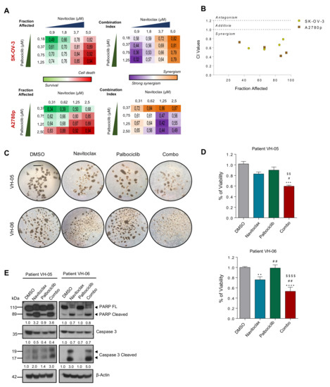 SK-OV-3 and A2780p cells seeded onto 96-well plates were treated with Palbociclib (Selleckchem, Houston, TX, USA), Abemaciclib (Selleckchem), Navitoclax (APExBio, Houston, TX, USA) and Venetoclax (APExBio, Houston, TX, USA) in a range of 0.01 to 25 µM or the combination of Palbociclib and Navitoclax. After five days, cells were fixed and stained with crystal violet. Combination index analysis was determined by the Chou–Talalay method using the Compusyn Software (1.0, ComboSyn Inc., Paramus, NJ, USA). For tumor patient-derived spheroids, spheres were incubated with the indicated drugs and their viability was assessed by MTS assay and immunoblot after 96 h.
