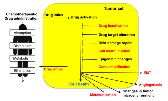MDR impairs the efficacy of chemotherapy against tumors, with over 90% treatment failure rate in metastatic cancers. Many mechanisms operate to confer drug resistance (Figure 1) [97]: scarce drug solubility and toxicity to normal tissues limit the doses of chemotherapeutic drugs that can be administered to cancer patients; pharmacokinetic issues, as absorption, distribution, metabolism, and elimination, reduce the amount of chemotherapeutic that effectively reaches cancer cells. Moreover, several mechanisms confer tumor cell drug resistance, e.g., low drug uptake caused by reduced expression or loss of influx transporters, enhanced drug efflux due to overexpression of drug efflux pumps, changes in lipid composition of the cell membrane, increased DNA damage repair, inhibition of apoptosis, alterations of cell cycle or checkpoints, off-target drug compartmentalization, increased drug catabolism, drug target structure modification, epithelial–mesenchymal transition (EMT).