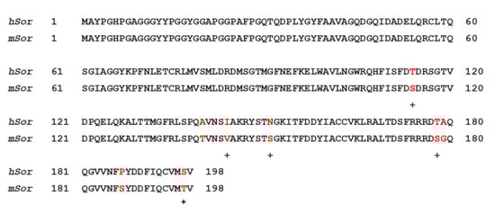 Sorcin is evolutionarily rather recent, being present in vertebrates, and more generally in metazoans. Sorcin sequence is highly conserved among species, e.g., human and mouse sorcin differ only by eight residues (T114S, A140T, I144V, N151S, T178S, A179G, P187S, S197T) (Figure 2, upper panel) among which three (in both human and mouse sorcin) are phosphorylatable serine and threonine residues of the C-terminal domain, possibly indicating species-specific phosphorylation-dependent sorcin regulation.