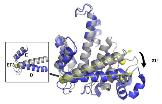 Upper panel. Alignment between human sorcin (hSor) and mouse sorcin (mSor). The variant residues are indicated in red. The “+” indicates residues with similar characteristics. Lower panel. The X-ray crystal structure of human sorcin in the apo form (gray) and in the calcium-bound form (blue; calcium ions are represented by yellow spheres). Upon calcium binding, sorcin activation occurs, with a transition from a closed to an open structure (see also detail of the EF3 hand), involving a movement of the long D-helix of 21°.