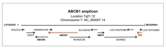 Many studies report that a genomic amplification of the ABCB1-containing chromosomal region 7q21.12 occurs in MD-resistant cancers and that overexpression of genes of such region contributes to MDR (Figure 5) [51,73,119,120,121,122,123,124,125,126,127,128,129,130,131]. Amplification of the chromosomal region 7q21 containing ABCB1 and SRI (sorcin gene) was described in multidrug-resistant leukemia, neuroblastoma, and lung tumor cells [122,125,132]. The amplicon includes the genes SRI, ADAM22, DBF4, SLC25A40, RUNDC3B (RPIP9), ABCB1, ABCB4, CROT, the TP53TG1 long non-coding RNA, TMEM243 and DMTF1 (Figure 5), all of which were found to be associated with carcinogenesis and MDR. In particular, sorcin and DBF4 overexpression are drivers of MDR in several types of cancers; the development of inhibitors of sorcin expression and of CDC7-DBF4 activity as potential anti-tumor candidates was recently accomplished. DBF4 is a CDC7 kinase regulatory subunit, important in cell proliferation and DNA replication, overexpressed together with CDC7 in many primary tumors and cancer cell lines, such as diffuse large B-cell lymphoma, colorectal cancer, ovarian cancer, melanoma, breast cancer, and oral squamous cell carcinoma, and are markers of poor prognosis and of advanced tumor grade; many tumors contain extra copies of the DBF4 gene [119,133,134,135,136,137,138]. Overexpression of CDC7-DBF4, reported in several human cancers, is considered a marker of MDR [123,126,133,139].