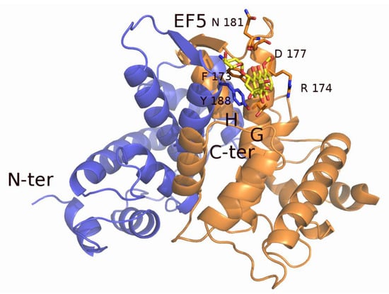 From a structural viewpoint, sorcin belongs to the small penta-EF-hand (PEF) family, which also comprises calpains, grancalcin, PDCD6, and peflin [79]. EF-hands are structural helix–loop–helix motifs, with a 12-residue interhelical sequence, able to bind Ca2+ with high affinity (with a pentagonal bipyramidal symmetry): calcium binding to proteins acts as a signal in a variety of cellular processes. Sorcin is a homodimer in the absence of calcium [4]; each monomer is formed by two domains, i.e., the flexible glycine-rich N-terminal domain (residues 1–32) and the C-terminal Ca2+ binding domain (SCBD, residues 33–198) containing with five EF-hands. Usually, Ca2+ binding proteins are endowed with an even number of EF-hands, both structurally and functionally coupled. In sorcin, EF-hands are coupled via short two-stranded β-sheets, such that EF1-EF2 and EF3-EF4 pairs are formed; EF5, although uncoupled in sorcin monomers, pairs with another EF5 hand (belonging to the second monomer) in dimeric sorcin, thereby forming part of the dimer interface [29,30,36].