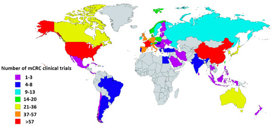 Currently, standard treatment for metastatic CRC (mCRC) includes chemotherapy, molecular targeted treatment, and surgery, though recently, rapid development has been made in the field of immunotherapy. The world map displayed in Figure 1 shows the number of mCRC clinical trials by country registered in ClinicalTrials.gov [4]. Many of these studies evaluating the efficacy of immunotherapy are currently ongoing in mCRC, either combined with or compared to chemotherapy.