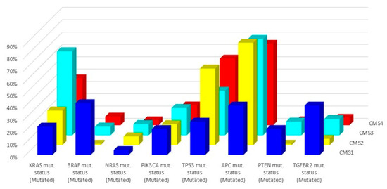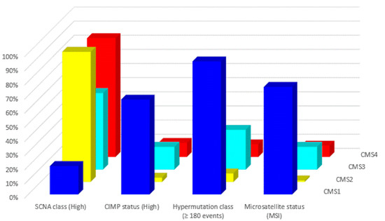 In 2015, a gene expression-based Consensus Molecular Subtype (CMS) classification system was created from an analysis of 4151 samples from stage II and III CRC patients [42]. Eighty-seven percent of the samples were assigned to a CMS (CMS1, CMS2, CMS3, CMS4), whereas 13% of cancers characterized by a mix of all subtypes remained unclassified. Key features of the 4 CMSs are presented in Table 2 and Figure 2 and Figure 3. The immune, inflammatory, angiogenic, and fibroblastic tumor microenvironment varies significantly between the 4 molecular subtypes [43]. CMS1 and CMS4 are ‘hot’ tumors characterized by strong immune infiltration. On the contrary, CMS2 and CMS3 are ‘cold’ tumors without immune activation. As Guinney et al. have pointed out [42], oncogene amplifications associated with CMS2 and the prominent metabolic activation of CMS3 tumors may be valuable tools for developing new therapeutic interventions in CRC patients. Several treatment strategies based on the 4 molecular subtypes of CRC have been proposed during the last years that could eventually overcome the absence of T cell infiltration and turn immunologically ‘cold’ tumors into ‘hot’ ones [44,45,46]. Research findings show that these approaches based on comprehensive analysis of CRC tumors have the potential to lead to customized treatments for individual patients, with improved clinical responses and fewer side effects.