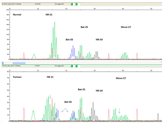 It has been found that mononucleotide markers have better sensitivity and specificity compared to dinucleotide markers [53]. Additionally, mononucleotide markers exhibit significantly lower polymorphism, compared to dinucleotide ones [54]. Therefore, panels consisting entirely of mononucleotide markers have been suggested. The current golden standard is considered to be the Microsatellite Instability Analysis Kit by Promega Corporation (Madison, WI, USA), which includes the markers BAT 25, BAT 26, NR 21, NR 24, and MONO-27. Figure 4 illustrates PCR results of an MSI-H patient, using the Promega Kit.