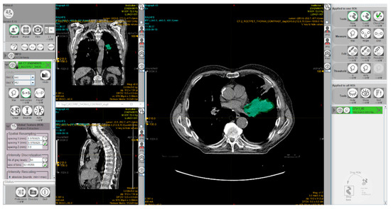 Radiomics is the analysis of a high number of quantitative features, extracted from tumor regions, metastatic lesions, or normal tissues depicted in radiological images. Radiomics data combined with artificial intelligence algorithms can be used to identify predictive patterns of interest and support objective decisions for cancer diagnosis and treatment. However, there is a great demand for ‘big data’ sources. Substantial efforts have been devoted in recent years toward developing imaging biobanks that make image sets available for radiomics and other investigations. Thus, the National Cancer Institute (NCI) of the USA has created the open-source, open access ‘Cancer Imaging Archive’ to support research and educational activities related to radiomics and image processing [68]. This archive includes patient exams performed by various image modalities including cases treated with immunotherapy. Moreover, several software packages have been developed to allow radiomic feature extraction [69,70,71]. Figure 5 shows a screenshot of the graphical user interface of a software package used for radiomics.