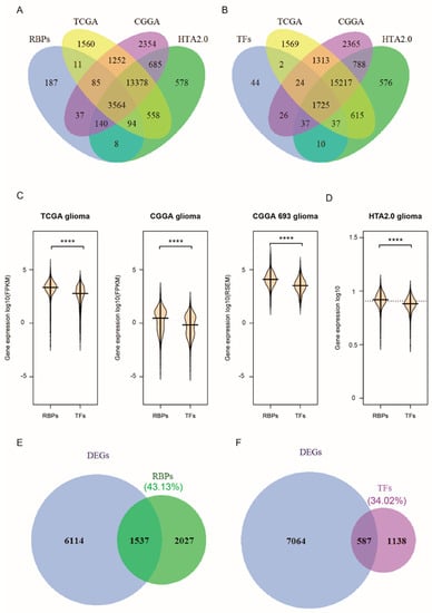 RNA-binding proteins show a significantly higher expression than transcription factors in glioma. (A) Venn diagrams of RNA-binding proteins in human glioma, (B) The transcription factors (TFs) in three glioma datasets, (C) bean plot of RBPs’ and TFs’ normalized expression in TCGA (left), CGGA datasets (middle) and the new CGGA dataset (right), (D) bean plot of RBPs’ and TFs’ normalized expression in our Microarray dataset, HTA2.0, which includes three glioma samples. The p-values were calculated using a Wilcoxon test by R (version 3.4.1) (p < 0.0001). (E,F) Venn diagrams of differentially expressed RBPs (E) and TFs (F). Differentially expressed genes (DEGs) analysis of GBM in the TCGA dataset was conducted by the R package, DEseq2 (p < 0.05). (**** p < 0.0001).