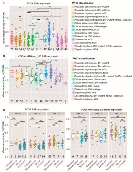 Associations between the expression of RBPs and molecular or clinical features in glioma patients. (A,B) RBPs’ normalized expression of different WHO classification gliomas in the TCGA (A) and CGGA (B) datasets. (C) RBPs normalized expression, stratified by the molecular subtype in TCGA glioma patients (left) and CGGA gliomas (right). (The p-values were calculated using a Wilcoxon test by R (version 3.4.1), * p < 0.05, ** p < 0.01, *** p < 0.001, **** p < 0.0001, NS: No significance, the numbers under all the graphs show the amount of samples.).