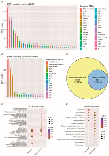 Functional enrichment analysis of canonical and noncanonical RBPs based on RNA-binding domains. (A,B) Canonical RBDs (A) and Noncanonical RBDs (B) of RBPs in human glioma. (C) The noncanonical RBPs constitute the majority of the RBPs in gliomas, (D) GO enrichment analysis of canonical and noncanonical RBPs based on biological processes. The y-axis shows a significantly enriched project (p < 0.05, FDR < 0.05). (E) KEGG pathway enrichment analysis of RBPs revealed that the noncanonical RBPs were enriched in the metabolism-related pathway. The y-axis shows a significantly enriched project (p < 0.05, FDR < 0.05).