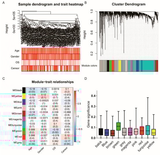 To further identify the association between RBPs and gliomas with different clinical characteristics, the expression data profile of these 3564 RBPs from TCGA were transformed into a gene co-expression network using a WGCNA package in R. The analysis was performed as described previously [27]. First, we selected 160 patients from the TCGA glioblastoma dataset with different ages, genders, and overall survival (OS) rates for RBPs expression clustering (Figure 4A). A total of 10 co-expressed modules were obtained through a one-step network construction method, where β = 6 (Figure 4B, Figure S3A). Then, we found a strong similarity of five co-expression modules (Figure S3C). Furthermore, we performed a correlation analysis between different co-expression modules and glioma sample traits (Figure 4C). The results indicate that the black module has the most significant correlation with age (correlation coefficient = −0.18, p = 0.03). The green module was significantly correlated with the overall survival of patients (correlation coefficient = −0.19, p = 0.02, Figure 4C). However, modules that are significantly related to gender have not been found. The distribution of the modules’ average gene significance related to OS are shown in Figure 4D and Figure S3D, among which the green module was also found to have the strongest association with the overall survival (OS) of GBM patients. Thus, this module was selected as the clinically most significant module of prognosis for further analysis.