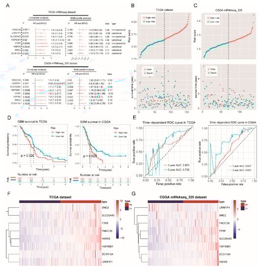 Survival analysis in the TCGA and CGGA mRNAseq_325 datasets. (A) the green module univariate and multivariate analysis in the TCGA (top) and CGGA mRNAseq_325 datasets (bottom), (B) the risk score distribution (top) and survival status distribution (bottom) for 160 GBM patients (TCGA dataset), (C) The risk score distribution (left) and survival status distribution (right) for 138 GBM patients (CGGA mRNAseq_325 dataset), (D) the Kaplan–Meier survival curves for the high- and low-risk groups in the TCGA (left) and CCGA mRNAseq_325 datasets (right), (E) the ROC curves for GBM patients, predicting the OS by the risk score in the TCGA (left) and CCGA mRNAseq_325 datasets (right), (F,G) a heat map of eight RBPs for the high- and low-risk groups (Hr: High-risk; Lr: Low-risk).