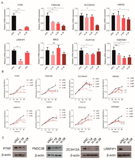 An MTS assay was used to measure the proliferation of the LN229 cell. (A) real-time quantitative PCR for the expression of eight RBPs in different groups, (B) proliferation of the LN229 cell after knocking down eight RBPs, (C) Western blot used to detect the knockdown effect of PTRF, FNDC3B, ZC3H12A, and LRRFIP1 (siNC: Negative Control; si-1#, si-2# and si-3#: They are different knockdown sequences of target genes, * p < 0.05, ** p < 0.01, *** p < 0.001).