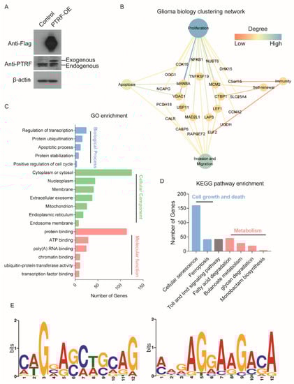 RIP-seq analysis. (A) Western blot confirming the expression of PTRF in the Flag-PTRF overexpression’s LN229 cell, (B) the glioma biology clustering network of target genes, (C) gene ontology enrichment analysis of the target genes of PTRF, (D) KEGG pathway analysis of the target genes of PTRF, (E) top two consensus motifs in the LN229 cell with Flag-PTRF overexpression.