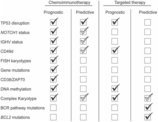 Prognosticators/Predictors in the context of chemoimmunotherapy and targeted therapy. Filled check marks identify biomarkers with a reported prognostic or predictive value in the setting of chemoimmunotherapy (left) or in the era of chemotherapy-free treatment with either Bruton’s tyrosine kinase, phosphoinositide 3-kinase inhibitors or B-cell lymphoma-2 (BCL2) inhibitors (right). In the context of chemoimmunotherapy, TP53 disruption is the only “true” predictive biomarker by consensus; other “proposed” predictive biomarkers are represented by empty check marks. TP53 disruption includes TP53 mutation and/or del17p; FISH karyotype: del11q, trisomy12, normal cytogenetics and del13q; gene mutations: BIRC3, SF3B1. Abbreviations: IGHV, immunoglobulin heavy chain variable gene; ZAP70, zeta chain associated protein 70; BCR, B-cell receptor.