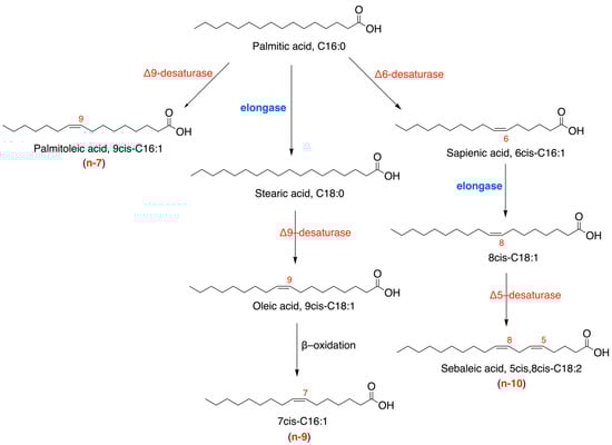Main structures of the C16 monounsaturated fatty acids (MUFA) family and their biosynthetic pathways, starting from palmitic acid.
