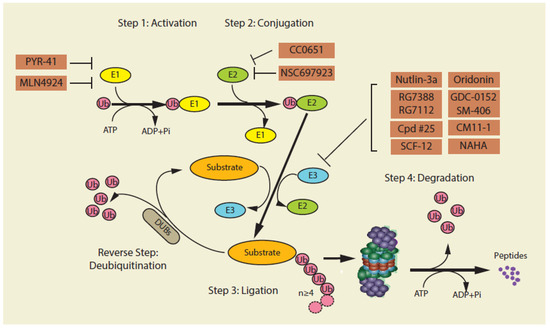 The 26S proteasome contains one/two 19S regulatory particles (19S RP) which mainly regulate the translocation of ubiquitinated proteins to the 20S CP and one 20S core particle (20S CP) in which proteolysis finally occurs [29,30]. In general, two main processes are associated with the process of degradation of proteins by the UPS: (1) tagging the to-be-degraded proteins by polyubiquitination (normally more than four ubiquitins), and (2) proteolytic degradation of the polyubiquitinated protein by the 26S proteasome complex [31,32]. Each step incorporates an intricate and complex spectrum of protein interactions and biochemical reactions (Figure 1).