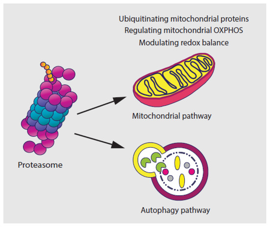 Several studies have suggested that the UPS modulates the physiology and the morphology of mitochondria, the powerhouse of mammalian cells, by ubiquitinating the outer mitochondrial membrane (OMM) proteins, including BAX, DRP1, MFN1/2, and VDAC [58,59,60,61,62]. Another study has shown that the UPS pathway plays an indispensable role in the regulation of mitochondrial energy metabolism by regulating the turnover of several mitochondrial oxidative phosphorylation (OXPHOS) proteins such as the succinate dehydrogenase subunit A (SDHA), the mitochondrial respiratory complex II [63,64]. Findings also indicate a mechanism of crosstalk between the proteasome and autophagy pathway [65,66,67,68,69]. This includes the degradation of synaptosomal-associated protein 29 (SNAP29) and syntaxin 17 (STX17) by the ubiquitin-independent 20S proteasome [70].