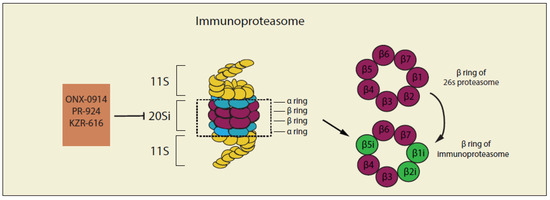Cells in the immune system express an inducible form of the proteasome called the immunoproteasome [245] which has different compositions of proteasome 20S core compared with the constitutive proteasome complex described above (Figure 4). In immunoproteasome, β5 (PSMB5), β1 (PSMB6), and β2 (PSMB7) of the constitutive proteasome complex are replaced by their respective inducible counterparts β5i (LMP7) β1i (LMP2), and β2i (MECL-1), under inflammatory conditions and certain pathological states including cancer [246]. It has been reported that immunoproteasomes are more efficient than constitutive particles in degrading polyubiquitinated proteins and are essential for removing damaged proteins in inflammatory states because they can efficiently digest misfolded proteins that form aggresome-like protein conjugates [247]. Several studies [248,249,250] have revealed that the expression level of immunoproteasome is much higher compared with that of constitutive subunits in B-cell malignancies, indicating the importance of the immunoproteasome in the regulation of protein homeostasis of hematologic diseases [251] and suggesting that targeting the function of immunoproteasomes could be a possible strategy for the treatment of cancer.