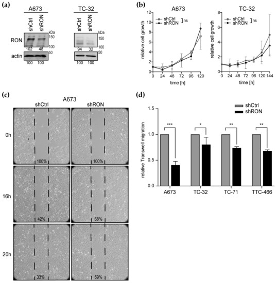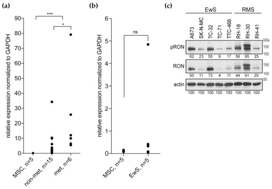 Our previous study found RON overexpressed in pediatric sarcomas compared to mesenchymal stem cells (MSCs) as a normal tissue control [22]. To confirm this microarray-based data, we analyzed RON transcript expression in an independent set of Ewing sarcoma tumor samples with matched clinical data using qPCR (real-time quantitative polymerase chain reaction) [23]. Relative to MSCs, RON was overexpressed in these tumors, and primary tumors from patients with metastatic disease showed higher RON levels than localized tumors (Figure 1a). A broad range of RON expression levels in Ewing sarcoma cell lines was not significantly different from the MSCs (Figure 1b). In two additional microarray datasets available through the R2: genomics analysis and visualization platform (https://r2.amc.nl), RON expression revealed broad distributions (Figure S1) [26,27]. All lines expressed the RON protein, as did the rhabdomyosarcoma cell lines, which were included into this study to address potential interaction of RON with its RTK family member MET (Figure 1c). Across this cell line panel, a relatively high-level of RON expression and activation were observed in A673, TC-32, RH-18 and Rh-30 compared to SK-N-MC, TC-71, TTC-466 and RH-41. In contrast to the RON transcript, MET expression of Ewing sarcomas and cell lines remained below the MSC levels (Figure S2). In keeping, MET protein was not detected in Ewing sarcoma cell lines, but expressed and phosphorylated in the RH-30 rhabdomyosarcoma control. Interestingly, MET was expressed but not phosphorylated in a genetically modified Ewing sarcoma cell line with shRNA-silencing of the specific Ewing sarcoma oncogene EWS-FLI1, which links the EWS-FLI1 oncogene to distinct scatter factor RTK expression patterns of pediatric sarcomas (Figure S2).