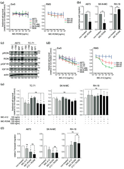 To target this cross-activation, we employed the monoclonal antibody IMC-A12 (cixutumumab) [34], which had reached phase II clinical studies. In a mechanism of action similar to IMC-RON8, IMC-A12 blocks IGF1 ligand–IGF1R receptor binding and signaling activation. Evaluating the effect of IMC-A12 on cell viability (Figure 4d), Ewing sarcoma cell lines revealed an overall intermediate response. Here, the TC-32 and TTC-466 (half-maximal inhibitory concentrations (IC50) < 10 µg/mL), 5838 and TC-71 (IC50 < 20 µg/mL) cell lines were more sensitive compared to more resistant A673 and SK-N-MC cells (IC50 > 100 µg/mL). Rhabdomyosarcoma cell lines presented a broader spectrum of sensitive (RH-41; IC50 < 0.1 µg/mL), intermediate (RH-30; IC50 < 20 µg/mL) and resistant lines (RH-18; IC50 undetermined). However in contrast to our hypothesis based on prior co-targeting of RON with siRNA and IGF1R tyrosine kinase inhibitor [22], combined treatment with IMC-RON8 and IMC-A12 did not overcome resistance or enhance effects on cell viability compared to single antibodies (Figure 4e). Similarly, parallel shRNA-silencing of RON did not alter the IMC-A12 effects on cell proliferation in vitro (Figure S3). Regarding cell migration, IMC-A12 alone had a significant inhibitory effect only on SK-N-MC, and thus not on A673 or RH-18 cells. Again, antibody-mediated co-targeting of both RTKs did not reveal synthetic inhibition of cell migration compared to RON targeting alone (Figure 4f).
