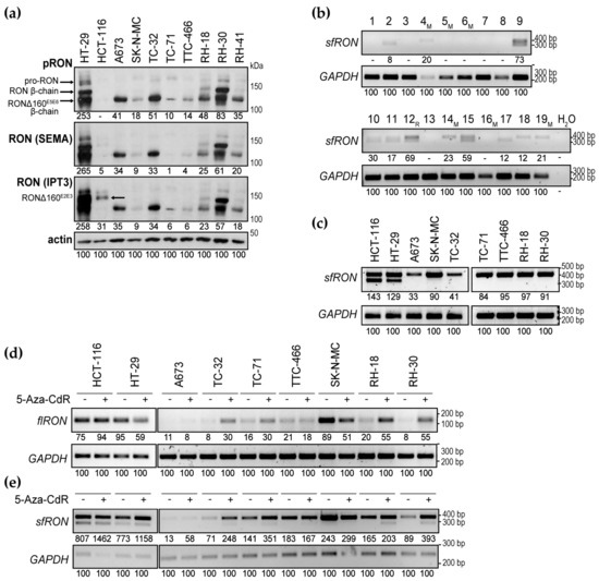 - Angeloni, D.; Danilkovitch-Miagkova, A.; Ivanova, T.; Braga, E.; Zabarovsky, E.; Lerman, M.I. Hypermethylation of Ron proximal promoter associates with lack of full-length Ron and transcription of oncogenic short-Ron from an internal promoter. Oncogene 2007, 26, 4499–4512. [Google Scholar] [CrossRef]