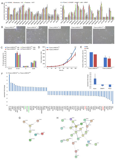 (A) Expression microarray data of SWI/SNF complex members in GCT tissues (left) and cell lines (right). Normal testis tissue (NTT) and fibroblasts (MPAF) were included as controls. Data were re-analyzed in context of this study. See ‘materials and method’-section for more details on expression microarray data. (B) Brightfield pictures of TCam-2-ARID1A+/+ and -ARID1A−/− cell morphology. Scale bar: 100 μm. (C) Measurement of cell cycle phase distribution by PI-based flow cytometry in TCam-2-ARID1A+/+ and -ARID1A−/− cells. (D) Growth curves of TCam-2-ARID1A+/+ and -ARID1A−/− clones (average) over seven days. p-values * < 0.05, ** < 0.005. (E) EdU proliferation assay of TCam-2-ARID1A+/+ and -ARID1A−/− clones (average) after 48 and 168 h. (F) Mass spectrometry data of proteins enriched or depleted in TCam-2-ARID1A−/− versus -ARID1A+/+ cells. Inlay: A qRT-PCR analysis confirmed upregulation of FA2H and downregulation of DMAP1 and POLE. GAPDH was used as housekeeper and for data normalization. (G,H) STRING-based interaction prediction of enriched (G) or depleted (H) proteins in TCam-2-ARID1A−/− versus -ARID1A+/+ cells.