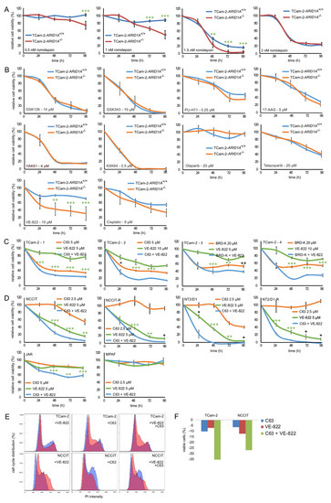 ARID1A loss-of-function mutations sensitize cancer cells towards inhibition of EZH2, ATR, PARP, HDAC6, and HSP90 (and others) [11,12,15,16]. Therefore, we asked, whether ARID1A-deficiency phenocopies these effects and if TCam-2-ARID1A−/− cells become sensitive towards EZH2-, ATR-, PARP-, HSP90- and HDAC6-inhibition as well as to cisplatin application (Figure 2B). First, we narrowed down the optimal treatment concentrations by treating TCam-2-ARID1A+/+ with various inhibitors, followed by measurement of changes in viability by XTT assays (Figure S3B). Next, we also treated TCam-2-ARID1A−/− cells with the optimal inhibitor concentrations.