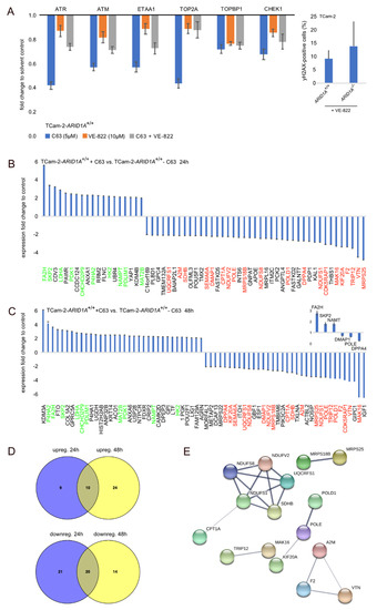 (A) qRT-PCR analysis of expression of ATR and DNA damage response associated factors in C63 (5 μM) and VE-822 (10 μM) treated TCam-2 cells. Inlay: Number of phospho-γH2AX-positive cells after 10 μM VE-822 treatment of TCam-2-ARID1A+/+ and -ARID1A−/− cells. (B,C) Mass spectrometry data of proteins enriched or depleted in TCam-2 cells treated for 24 (B) and 48 h (C) with C63. Inlay: A qRT-PCR analysis confirmed upregulation of FA2H, SKP2 and NAMT as well as downregulation of DMAP1, POLE and DPPA4. GAPDH was used as housekeeper and for data normalization. (D) Venn diagram summarizing commonly enriched or depleted proteins in TCam-2 cells treated for 24 and 48 h with C63. (E) STRING-based interaction prediction of proteins commonly depleted in C63 treated TCam-2 (24 + 48 h).