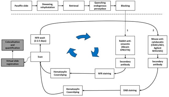 Figure 1 outlines the SCIM technique we implemented to evidence cells co-expressing VIM and pan-CK, and is detailed as follows. Tissue sections (5 µm thick) were subjected to standard IHC on a Ventana Discovery XTTM (Ventana Medical Systems, Inc., Tucson, AZ, USA) using the RedMap detection system according to the manufacturer’s protocols. Briefly, the FFPE tissue sections were deparaffinized and rehydrated. Antigen retrieval solution (EDTA, pH8.4, cat. no. 950-124; Ventana Medical Systems, Inc.) was applied for 36 min at 100 °C. Then, the slides were incubated with the rabbit monoclonal anti-VIM antibody for 60 min at 37 °C (1:1250, clone EPR3776, cat. no. ab92547; Abcam, Cambridge, UK.). The slides were washed and incubated with the biotinylated anti-rabbit secondary antibody for 24 min (1:200, cat. no. BA-1000, Vector Laboratories, Ltd., Peterborough, UK) followed by the addition of complex streptavidin-alkaline phosphatase. Immunostaining was detected by incubation with naphthol and Fast Red (NFR). The IHC slides were counterstained with Gill’s hematoxylin for 2 min at room temperature, dehydrated, and mounted. The whole slides were digitized at 20× (0.453 µm side pixel) using a NanoZoomer 2.0 HT scanner (Hamamatsu, Hamamatsu city, Japan), which was previously calibrated using a specific slide provided by the manufacturer. The IHC slides were then demounted, incubated in 100% ethanol for two days, until complete red color erasing, and rehydrated. The slides were then submitted to a second IHC protocol to evidence pan-CK expression. The slides were incubated with a mouse monoclonal anti-pan-CK antibody for 60 min at 37 °C (1:200, clone CKAE1/AE3, cat. no. M351529, Agilent Technologies Belgium S.A./N.V., Diegem, Belgium). The slides were then washed and incubated with the biotinylated anti-mouse secondary antibody for 24 min (1:200, cat. no. BA-2001, Vector Laboratories, Ltd.) followed by the addition of complex streptavidin-horseradish peroxidase. Pan-CK immunostaining was detected by incubation with diaminobenzidine (DAB) and hydrogen peroxide. Finally, the IHC slides were counterstained with Gill’s hematoxylin for 2 min at room temperature, dehydrated, mounted, and digitized (as mentioned above for VIM).