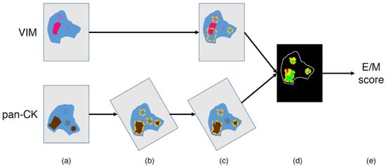 Image processing workflow to quantify the hybrid epithelial/mesenchymal (E/M) score. (a) Input images, (b) image registration and automatic annotation of the pan-CK-positive (pan-CK+) regions at low (4×) magnification, (c) manual exclusion of irrelevant annotations (e.g., necrosis areas and/or tissue defects), (d) Vim-positive (VIM+) and pan-CK+ detection in the final annotations (cf. details in Figure 3), and (e) E/M score computation (cf. details in Figure 3).