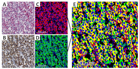 First of all, the whole-slide images were normalized using a methodology that we previously detailed and validated []. This approach ensured that the quantitative IHC analyses were not impacted by possible staining variations between the different IHC batches, which were required to process the large slide series.
