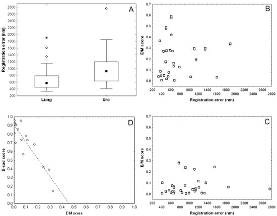 Registration errors were measured on 57 pairs of virtual slides provided by the SCIM technique targeting VIM and pan-CK expression on lung (n = 26) and urothelial (n = 31) carcinoma samples. On the complete series the average error was 863nm, with lower registration errors for lung samples as compared to urothelial ones as shown in Figure 5a (Mann–Whitney test: p = 0.0046). The registration error remained lower than 2 µm (except one outlier), i.e., about the pixel side size at 5× magnification, and was lower than 1 µm (i.e., about the pixel side size at 10×) for more than 75% of lung samples and more than 50% of urothelial ones (Figure 5a). These data motivated us to compare the hybrid E/M scores computed at 10× and 5× magnification. Figure 5b,c show a very good match between the paired E/M scores calculated at 10× resolution (denoted by dots) and those at 5× (denoted by overlapping squares), and extracted from the same slide and thus with the same registration error (x-value). This indicates that there is little to no difference between the two scores. In addition, the absolute differences between scores at 5× and at 10× did not significantly increase with registration error, as indicated by a very low (and not significant) Spearman correlation between these two features (rs = 0.24 with p = 0.25 for the lung series, and rs = 0.22 with p = 0.24 for the urothelial one). However, the E/M scores were higher in lung tumors than in urothelial tumors, with median scores of 15.3% and 4.6% (at 10× magnification), respectively (Mann–Whitney test: p = 0.001).