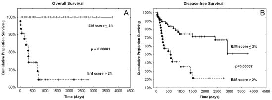 - The advanced E/M score binarized with respect to this threshold had a very significant prognostic value, as evidenced by the log-rank test for OS (p = 0.00012) and DFS (p = 0.00034).