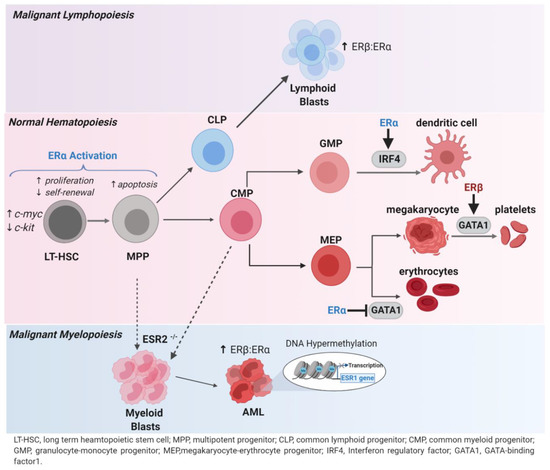 The role of estrogen receptors in hematopoiesis and acute myeloid leukemia (AML). In hematopoiesis, the activation of ERα by estradiol or tamoxifen increased proliferation and decreased self-renewal of primitive long-term hematopoietic stem cells (LT-HSC). The upregulation of c-myc and downregulation of c-kit upon ERα activation contributes to this phenotype. Multipotent progenitors (MPP) undergo apoptosis while ERα-mediated activation of IRF4 encourages dendritic cell differentiation. Additionally, ERα-mediated inhibition of GATA1 increases erythropoiesis while the ERβ-mediated activation of GATA1 results in increased megakaryocyte polyploidization to produce platelets. In malignancy, lymphoid-related cancers predominantly express the ERβ subtype and its activation inhibits tumor growth. The knockdown of ESR2, the gene encoding ERβ, leads to a myeloproliferative disease in mice resembling chronic myeloid leukemia. The possible origins of this disease are unknown and thus symbolized by dashed arrows. In AML, the DNA hypermethylation of ESR1 is prominent among patients and results in decreased transcription of ERα. ERα hypermethylation often co-occurs with the methylation of other tumor suppressor genes, which also influences patient prognosis and the response to hypomethylating agents. A subset of AML patients also express increased ERβ compared to ERα, and it has been shown that this subset would best be targeted by an ERβ agonist.