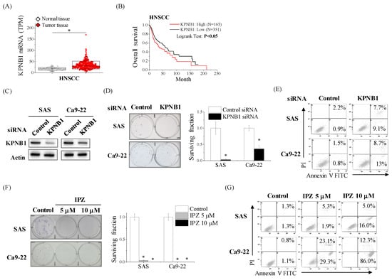 We first profiled the clinical status of KPNB1 in HNSCC by re-analyzing data from The Cancer Genome Atlas (TCGA) cohorts via Cancer RNA-Seq Nexus or cBioportal for Cancer Genomics (see Section 4.13 for URLs). As shown in Figure 1A, TCGA RNA-seq data of the HNSCC cohort revealed that the expression level of KPNB1 in tumor tissue was significantly higher than that of normal tissue. In addition, the Kaplan–Meier analysis on the TCGA cohorts showed that HNSCC patients with high expressions of KPNB1 resulted in a poor outcome (Figure 1B). These findings imply that KPNB1 is related to the malignancy of HNSCC; therefore, we next examined whether KPNB1 is functionally involved in the proliferation as well as the viability of HNSCC cell lines (SAS and Ca9-22) using the knockdown of KPNB1 by siRNA transfection or the KPNB1 inhibitor IPZ. The silencing of KPNB1 by siRNA decreased the clonogenic potential to about 3% for SAS cells and 36% for Ca9-22 cells, respectively (Figure 1C,D), and enhanced the apoptosis of both SAS and Ca9-22 cells (Figure 1E). Furthermore, the dose-dependent treatment with IPZ decreased the viable cell number of SAS and Ca9-22 cells (Figure S1). The 50% inhibitory concentrations (IC50) of IPZ were 2.9 μM for SAS cells and 0.9 μM for Ca9-22 cells (Figure S1). IPZ decreased the clonogenic potential and enhanced the apoptosis of HNSCC cells (Figure 1F,G). Taken together, these results indicate that KPNB1 is involved in the proliferation of HNSCC cells.
