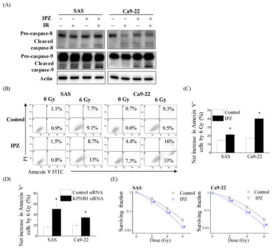 IPZ enhances the radiation-induced apoptosis and radiosensitivity of HNSCC cells. (A) IPZ (10 μM) was added to the culture medium 1 h before X-ray irradiation. After 20 h-incubation, the cell-culture-conditioned medium was replaced with fresh media and the cells were further cultured for 24 h. The cultured SAS and Ca9-22 cells were harvested for Western blot analyses of caspase-8 and -9. The representative immunoblots are shown. Actin was used as loading control. (B,C) IPZ (10 μM) was added to the culture medium 1 h before X-ray irradiation. After 20 h-incubation, the cell-culture-conditioned medium was replaced with fresh media and the cells were further cultured for 3 days. After culturing, the SAS and Ca9-22 cells were harvested for apoptosis assay using annexin V/PI staining. (B) The representative cytograms are shown. Inset numbers indicate the proportion of annexin V+/PI− cells or annexin V+/PI+ cells. (C) The results are presented as the net increase in the population of annexin V+ cells (the sum of annexin V+/PI− cells or annexin V+/PI+ cells) by 6 Gy irradiation. Data are presented as the mean ± SD of three independent experiments. * p < 0.05 versus DMSO control. (D) SAS and Ca9-22 cells transfected with control or KPNB1 siRNA were irradiated with 6 Gy X-ray and cultured for 4 days. After culturing, the cells were harvested for apoptosis assay using annexin V/PI staining. The results are presented as the net increase in the population of annexin V+ cells (the sum of annexin V+/PI− cells or annexin V+/PI+ cells) by 6 Gy irradiation. Data are presented as the mean ± SD of three independent experiments. * p < 0.05 versus control siRNA. (E) IPZ (10 μM) was added to the culture medium 1 h before X-ray irradiation. After 20 h-incubation, the cell-culture-conditioned medium was replaced with fresh media and the cells were further cultured until the colony was observed. The surviving fraction of SAS and Ca9-22 cells is shown. Data are presented as the mean ± SD of three independent experiments performed in triplicate. * p < 0.01 versus DMSO.