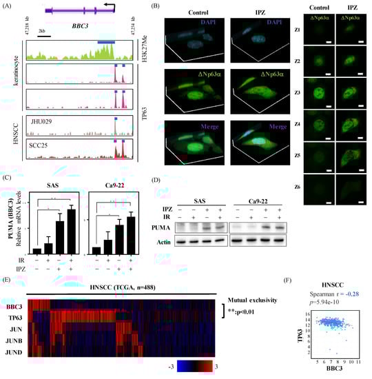 IPZ silences pro-apoptotic p53-upregulated modulator of apoptosis (PUMA) by suppressing the ΔNp63a nuclear import in HNSCC cells. (A) The occupancy profiles of H3K27me and TP63 at the BBC3 (PUMA) promoter in keratinocytes and HNSCCs. (B) Confocal imaging of ΔNp63α in SAS cells. Three-dimensional construction with maximum intensity (Left), and sequential z-stack imaging (Right), respectively. (C,D) IPZ (10 μM) was added to the culture medium 1 h before X-ray irradiation. After 20 h-incubation, the cells were harvested for qRT-PCR and Western blot analyses. (C) qRT-PCR analysis of PUMA expression levels. Data are presented as the mean ± SD of three independent experiments performed in triplicate. * p < 0.05, ** p < 0.01 versus DMSO control. (D) Western blot analysis of PUMA expression. The representative images are shown. (E) The heat map showing mutual exclusivity between BBC3 (PUMA) expression and TP63, as well as activator protein 1 (AP-1) family genes. The samples were divided according to mRNA expression levels (mRNA expression z-Scores (RNA-Seq V2 RSEM) > mean + 1.0 SD) from the TCGA cohorts. The P values are based on Fisher’s exact test. (F) The correlation between each BBC3 (PUMA) mRNA and TP63 mRNA in HNSCC from TCGA.