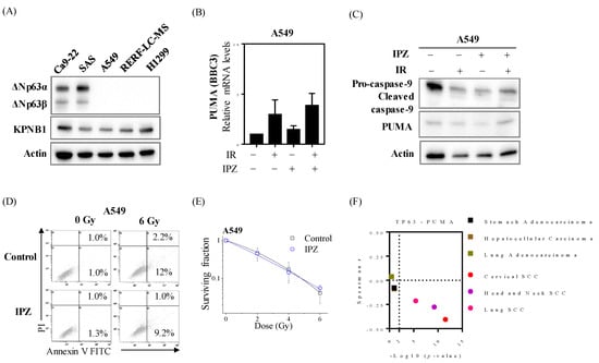 Radiosensitization effects through abolishing ΔNp63α-mediated PUMA silencing is unique to HNSCC cells. (A) Western blot analysis of ΔNp63 and KPNB1 expression. The representative image is shown. (B,C) IPZ (10 μM) was added to the culture medium 1 h before X-ray irradiation. After 20 h-incubation, the cells were harvested for qRT-PCR and Western blot analyses. (B) qRT-PCR analysis of PUMA expression levels. Data are presented as the mean ± SD of three independent experiments performed in triplicate. (C) Western blot analysis of PUMA expression. The representative image is shown. (D) IPZ (10 μM) was added to the culture medium 1 h before X-ray irradiation. After 20 h-incubation, the cell-culture-conditioned medium was replaced with a fresh medium, and the cells were further cultured for 3 days. After culturing, the A549 cells were harvested for apoptosis assay using annexin V/PI staining. The representative cytograms of annexin V/PI are shown. Inset numbers indicate the proportion of annexin V+/PI− cells or annexin V+/PI+ cells. (E) IPZ (10 μM) was added to the culture medium 1 h before X-ray irradiation. After 20 h-incubation, the cell-culture-conditioned medium was replaced with fresh media and the cells were further cultured until the colony was observed. The surviving fraction of A549 cells is shown. Data are presented as the mean ± SD of three independent experiments performed in triplicate. (F) Correlation analysis was performed based on Spearman r and p values between TP63 and PUMA from the TCGA datasets.