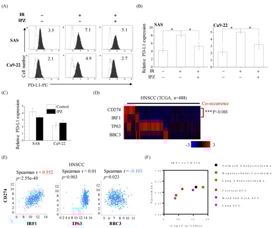 The effects of KPNB1 inhibition on radiation-increased cell surface PD-L1 expression in HNSCC cells. (A,B) IPZ (10 μM) was added to the culture medium 1 h before X-ray irradiation. The SAS cells were cultured for 4 days in the presence of IPZ after irradiation. In terms of Ca9-22 cells, the cell culture-conditioned medium was replaced with fresh media at 20 h after irradiation and the cells were further cultured for 3 days. (A) The representative histograms of PD-L1 expression on SAS and Ca9-22 cells are shown. The dotted line and filled black histograms indicate the isotype control and the PD-L1 expression, respectively. Inset numbers indicate the relative values of the mean fluorescence intensity of PD-L1 compared with isotype control. (B) Data are presented as the mean ± SD of three independent experiments. * indicates p < 0.01. (C) The quantification of PD-L1 expression levels in HNSCC cells upon IPZ treatment is shown. Data are presented as the mean ± SD of three independent experiments. (D) The heat map showing co-occurrence between PD-L1 (CD274) expression and IRF1. The samples were divided according to mRNA expression levels (mRNA expression z-Scores (RNA-Seq V2 RSEM) > mean + 1.0 SD) from the TCGA cohorts. P values are based on Fisher’s exact test. (E) Correlation between CD274 mRNA and each of IRF1, TP63, and BBC3 (PUMA) mRNA in HNSCC from TCGA. (F) Correlation analysis was performed based on Spearman r and p values from TCGA cohorts.